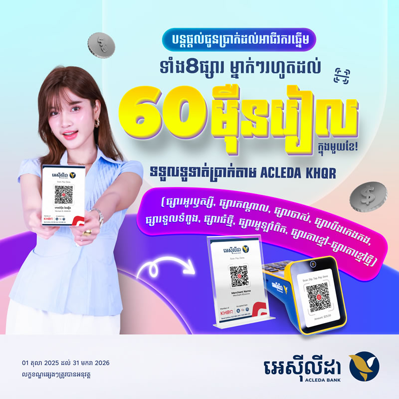 - Encourage more customers to pay with ACLEDA KHQR using ACLEDA Super App or other bank apps from KHR 5,000 or USD 1.25 per transaction.