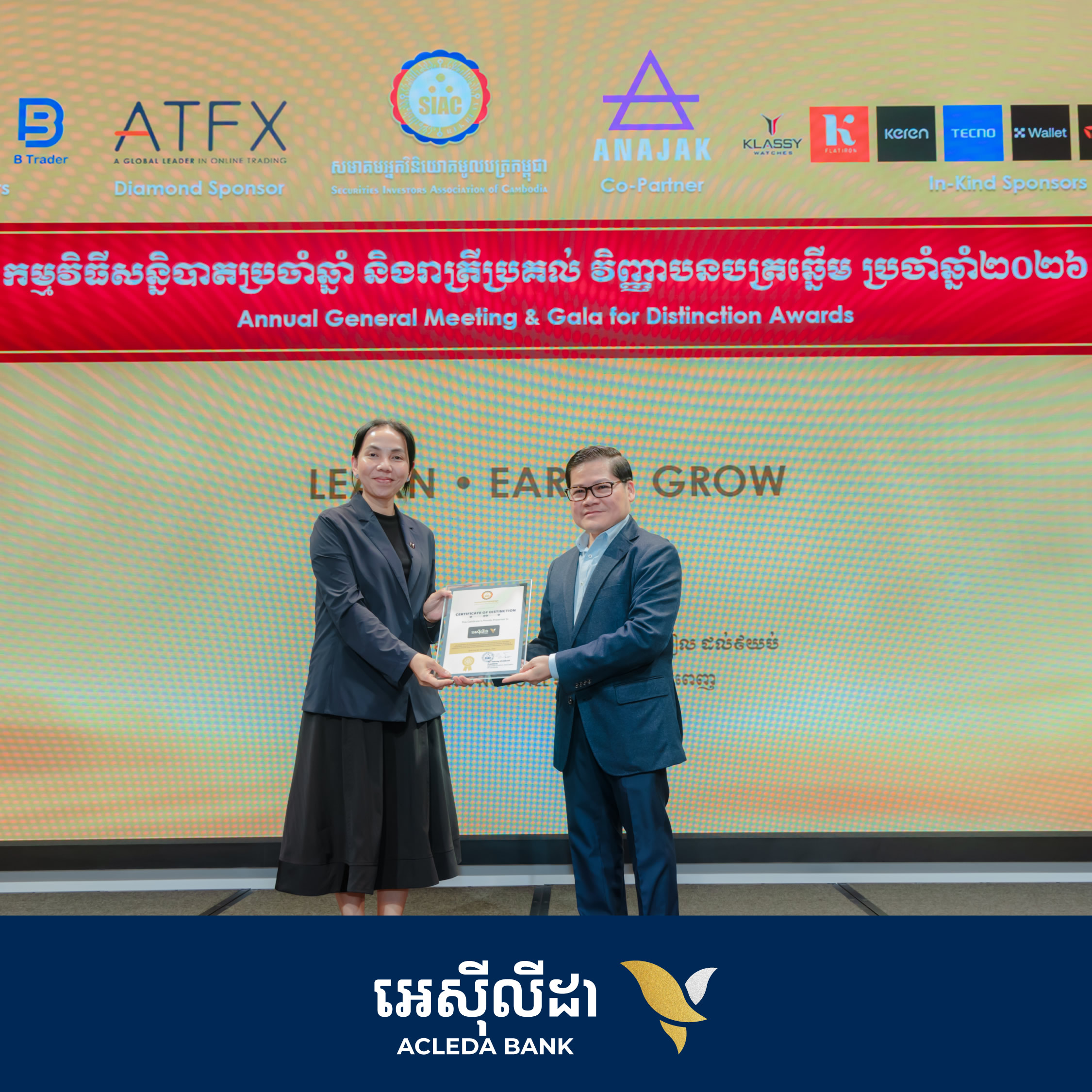 ACLEDA Bank is honored and proud to receive the Certificate of Distinction from the Securities Investors Association of Cambodia.