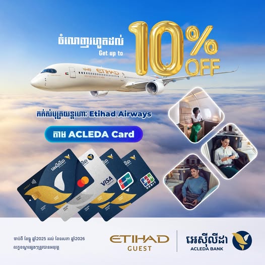 Get up to 10% off for booking Etihad Airways flights with your ACLEDA cards.