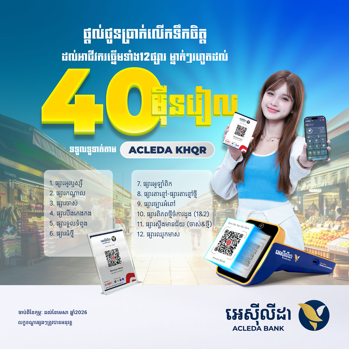 Applicable for all ACLEDA partners nationwide (Phnom Penh and 24 Provinces) from January to April 2026. Top 30 merchants in Phnom Penh and each province (total of 750 merchants per month) will get cash prizes! See more
