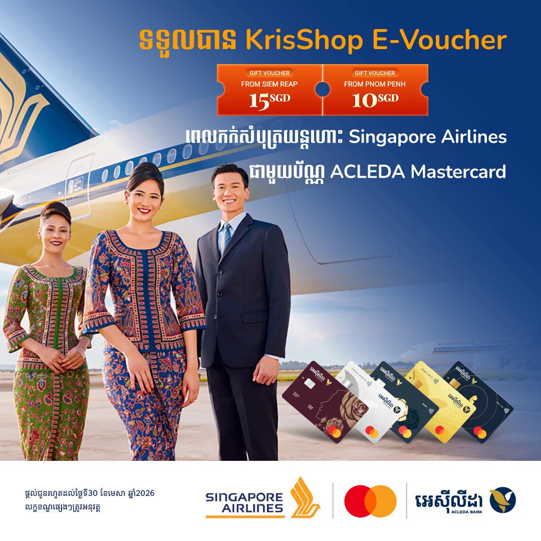 - បញ្ចុះតម្លៃ ១២% សម្រាប់ ACLEDA Mastercard World (ការបញ្ចុះតម្លៃត្រឹម ៤៥ដុល្លារ) និង ៨% សម្រាប់ ACLEDA Mastercard Gold/Classic (ការបញ្ចុះតម្លៃត្រឹម ២៥ដុល្លារ)។