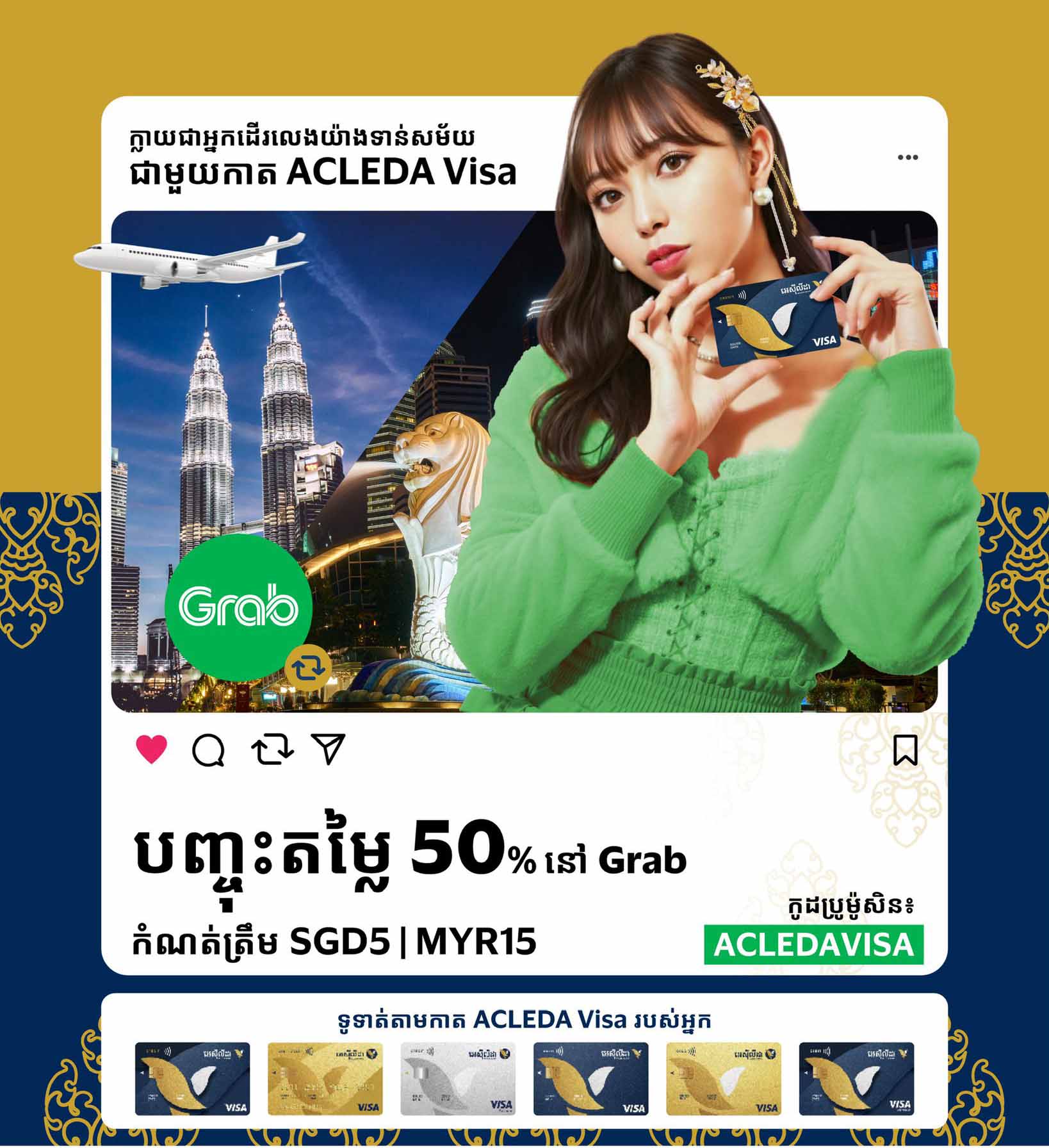 ប្រើប្រាស់ អេស៊ីលីដា វីសាកាត ដើម្បីទូទាត់ប្រាក់ រាល់ការកក់ Grab នៅប្រទេសសិង្ហបុរី និងម៉ាឡេស៊ី បានយ៉ាងងាយស្រួល ហើយលោកអ្នកនឹងទទួលបានការបញ្ចុះតម្លៃដ៏ច្រើន រហូតដល់ SGD 5 នៅប្រទេសសិង្ហបុរី ឬ MYR 15 នៅប្រទេសម៉ាឡេស៊ី ដោយប្រើប្រាស់ប្រូម៉ូកូដ "ACLEDAVISA"