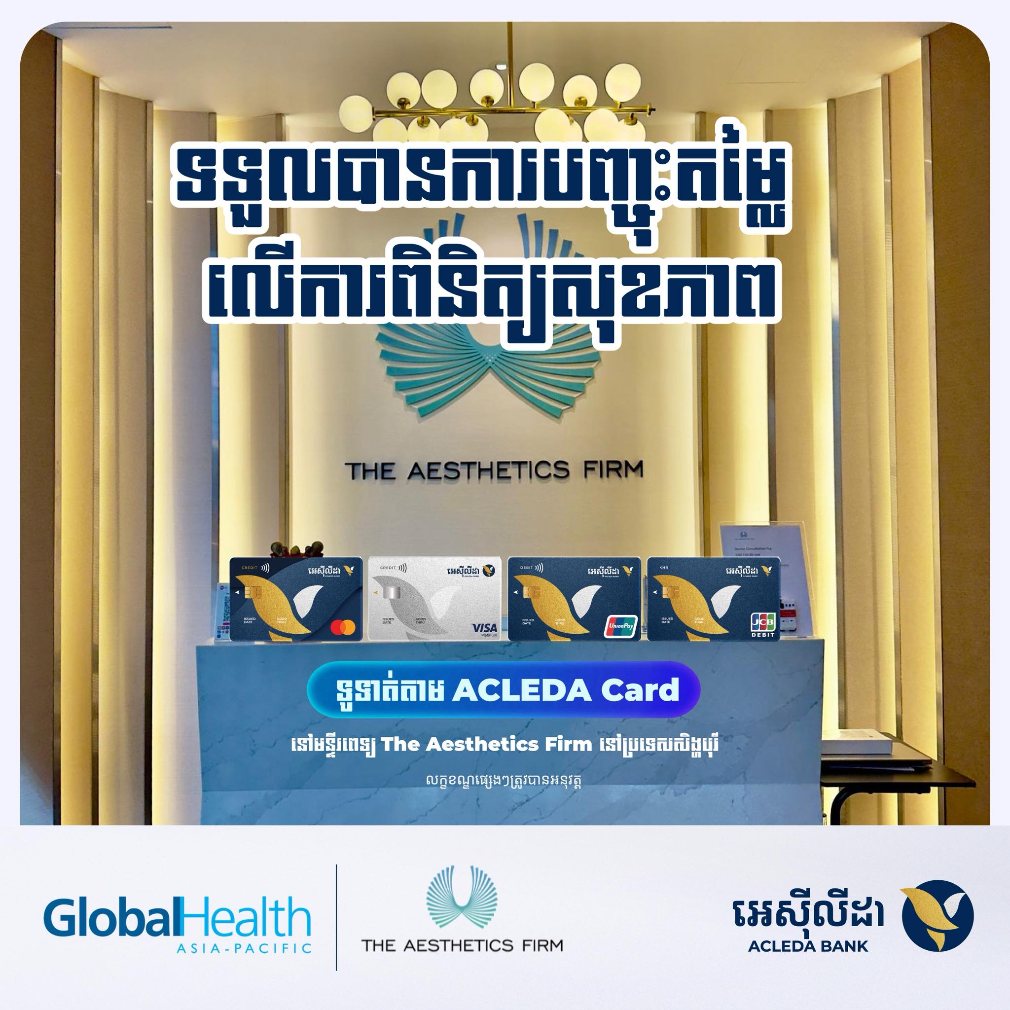 - បញ្ចុះតម្លៃ 10% សម្រាប់ ACLEDA Mastercard World និង 8% សម្រាប់ ACLEDA Mastercard Gold/Classic (ការបញ្ចុះតម្លៃត្រឹម 30 ដុល្លារ)។