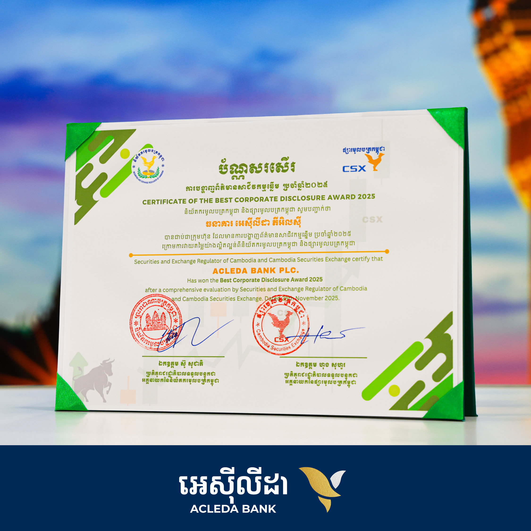 ធនាគារ អេស៊ីលីដា ភីអិលស៊ី មានមោទនភាពបានជាប់ជាក្រុមហ៊ុន ដែលមានការបង្ហាញព័ត៌មានសាជីវកម្មឆ្នើម ប្រចាំឆ្នាំ២០២៥ ក្រោមការវាយតម្លៃយ៉ាងល្អិតល្អន់ពី និយ័តករមូលបត្រកម្ពុជា និងផ្សារមូលបត្រកម្ពុជា។កាលបរិច្ឆេទ ៖ ២៨ វិច្ឆិកា ២០២៥