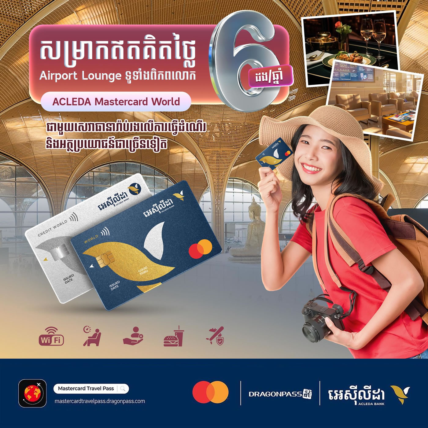 - បញ្ចុះតម្លៃ 10% សម្រាប់ ACLEDA Mastercard World និង 8% សម្រាប់ ACLEDA Mastercard Gold/Classic (ការបញ្ចុះតម្លៃត្រឹម 30 ដុល្លារ)។