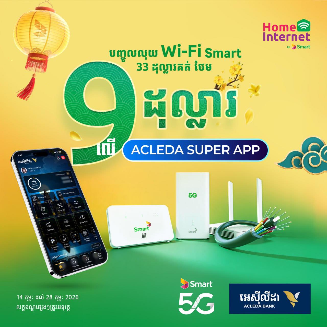 អតិថិជន 5G Wi-Fi, Smart Fiber+ និង Smart @Home គ្រាន់តែបញ្ចូលលុយ 33ដុល្លារគត់ ក្នុងមួយប្រតិបត្តិការ តាមអេស៊ីលីដាស៊ូភើអេប នោះលោកអ្នកនឹងទទួលបាន 9ដុល្លារ បន្ថែមភ្លាមៗតែម្ដង ចាប់ពីថ្ងៃទី14 ដល់ទី28 ខែកុម្ភៈ ឆ្នាំ2026 នេះ។