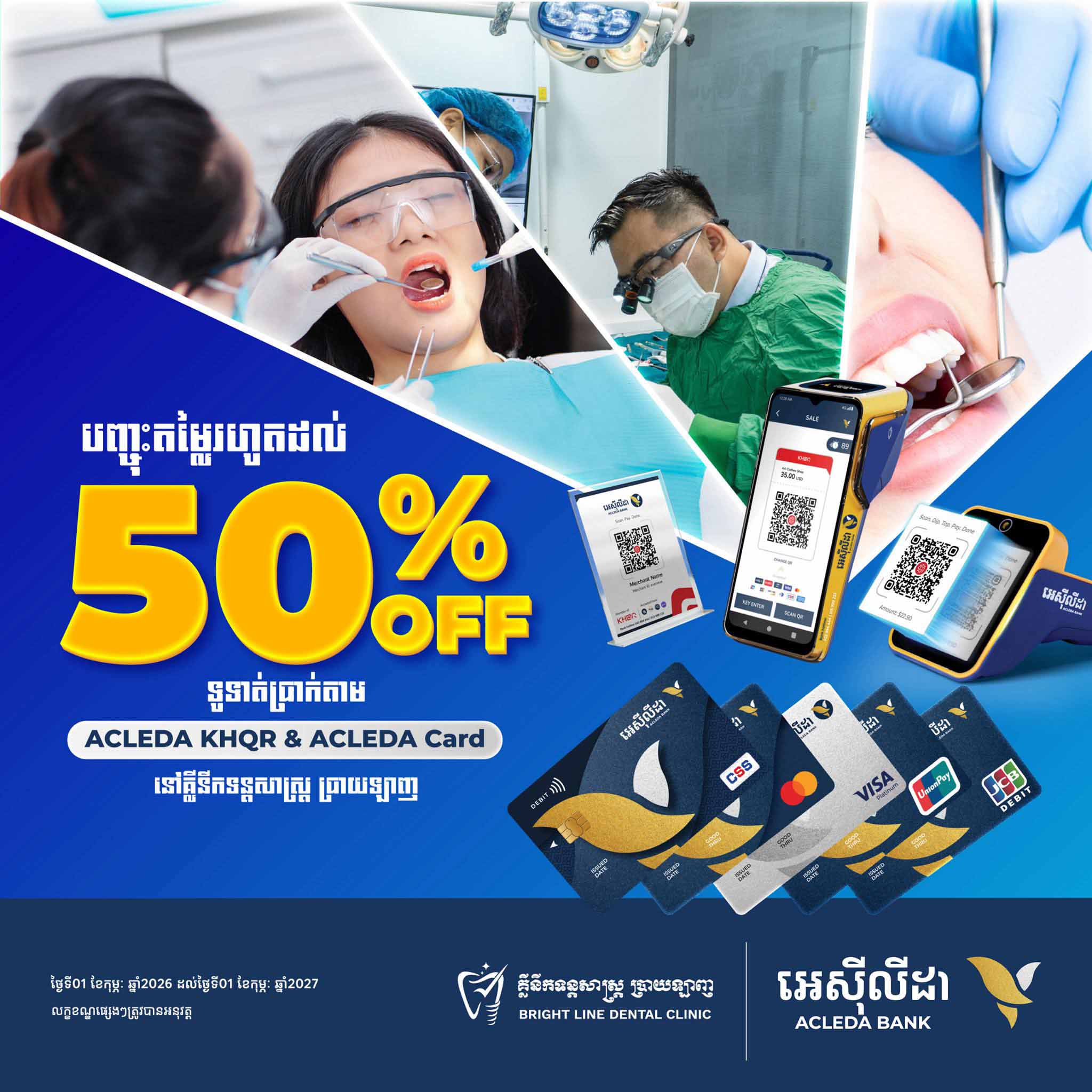 បញ្ចុះតម្លៃពិសេស រហូតដល់ 50% ដោយទូទាត់ប្រាក់តាម "អេស៊ីលីដា KHQR" ជាមួយអេស៊ីស៊ូភើអេប ឬតាមប័ណ្ណអេស៊ីលីដា គ្រប់ប្រភេទ នៅ Bright Line Dental Clinic គ្លីនីកទន្តសាស្រ្តប្រាយឡាញ