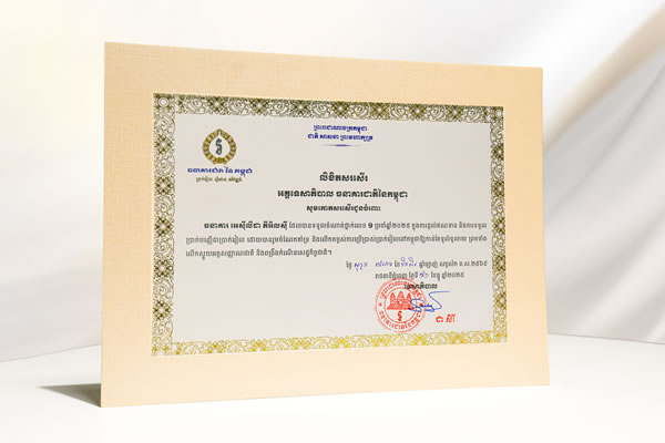 Certificate of appreciation from the National Bank of Cambodia (NBC) to ACLEDA Bank for supporting public schools students' visits to the Preah Srey Içanavarman Museum of Economy and Money (SOSORO), which contributes to promoting the education and understanding of Cambodia's economic and monetary history of Cambodian youth.June 16, 2025