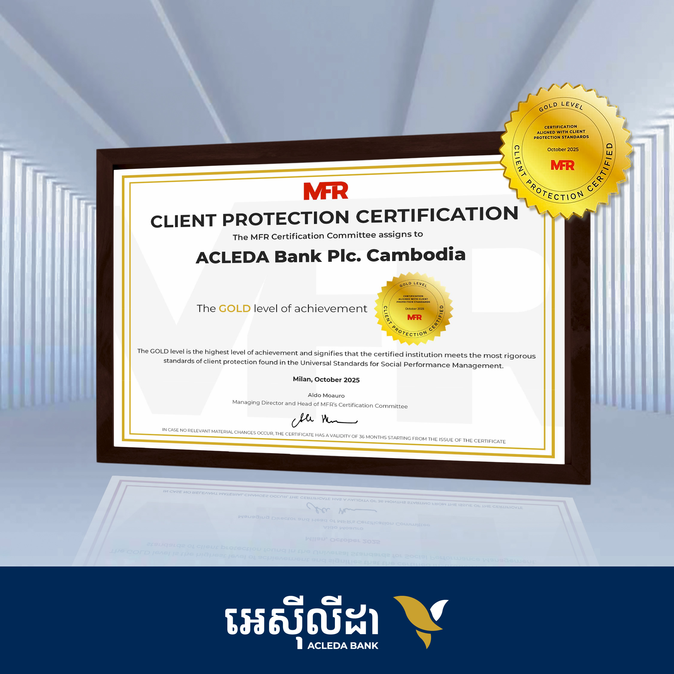 ACLEDA Bank is honored to receive the Gold Level Certification for Client Protection from MFR Global Rating Agency - the highest recognition of our commitment to ethical and responsible banking. Read morearrow_forward
