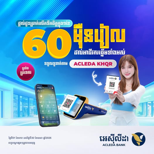 Applicable for all ACLEDA partners nationwide (Phnom Penh and 24 Provinces) from January to April 2026. Top 30 merchants in Phnom Penh and each province (total of 750 merchants per month) will get cash prizes!