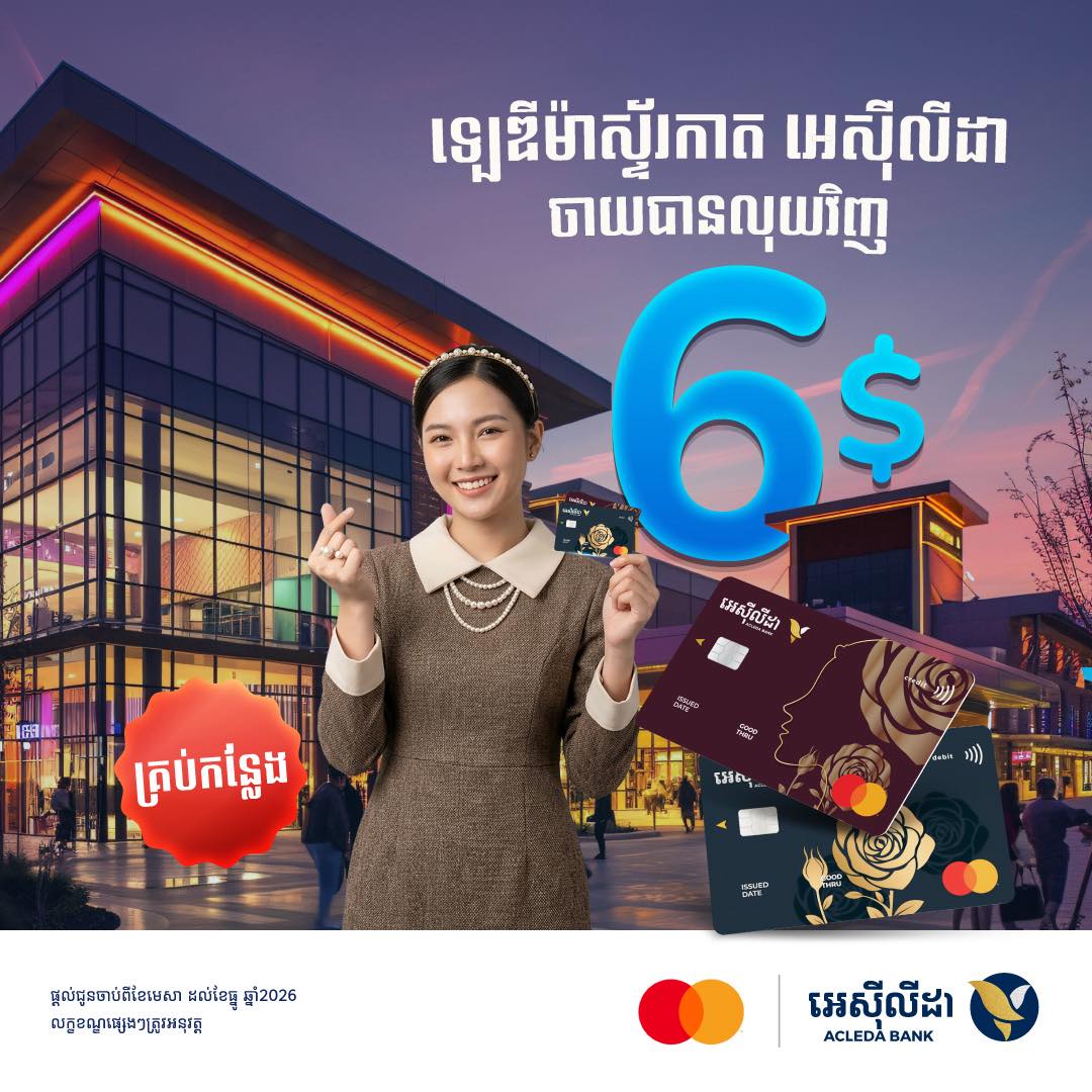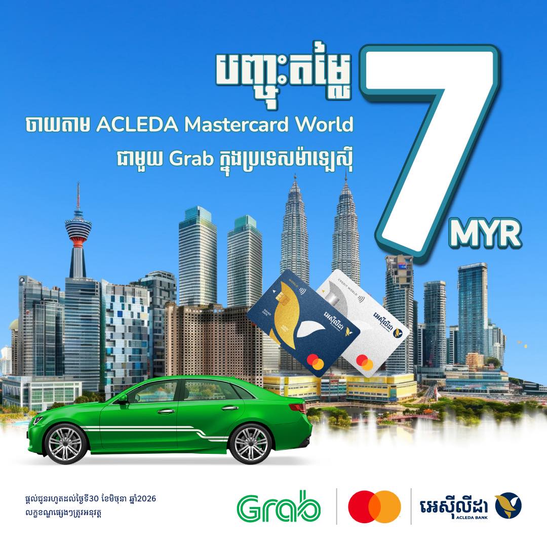 - 10% discount for ACLEDA Mastercard World and 8% discount for ACLEDA Mastercard Gold/Classic (capped at US$30).