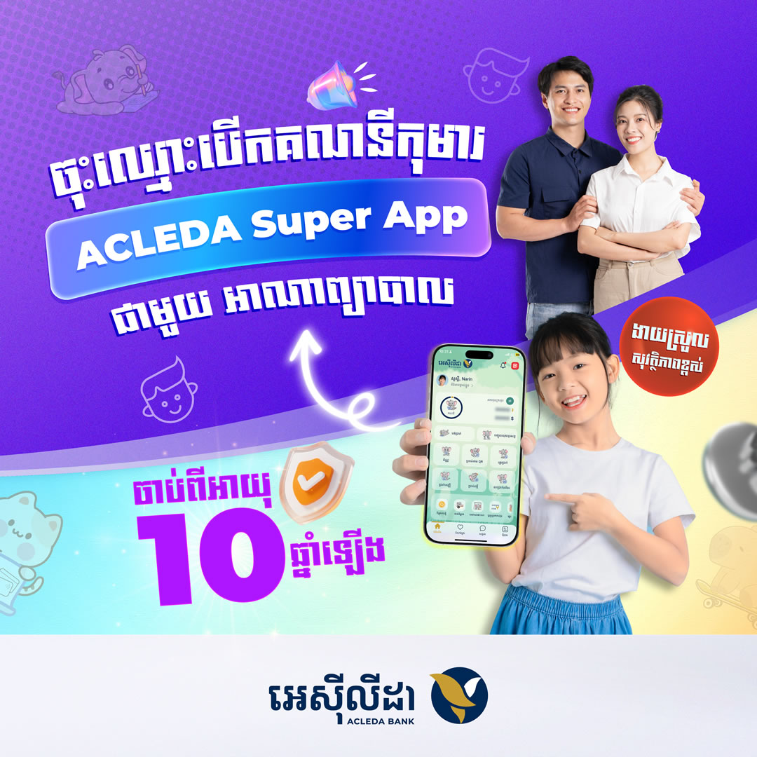 verifiedYou can register ACLEDA mobile super app for your minor (kid/child) from 10 years old to under 15 years old to use ACLEDA Super App and under your control.